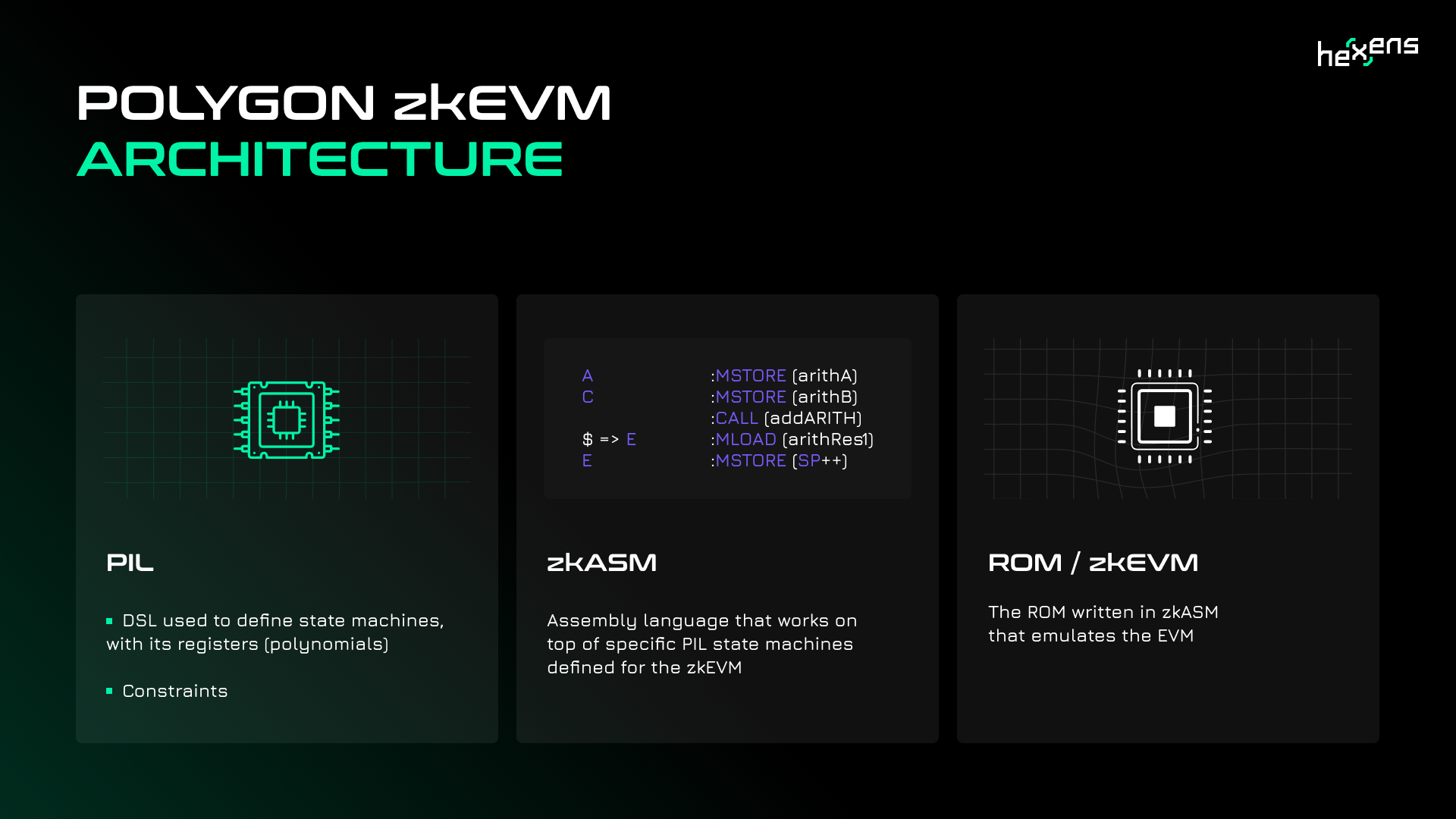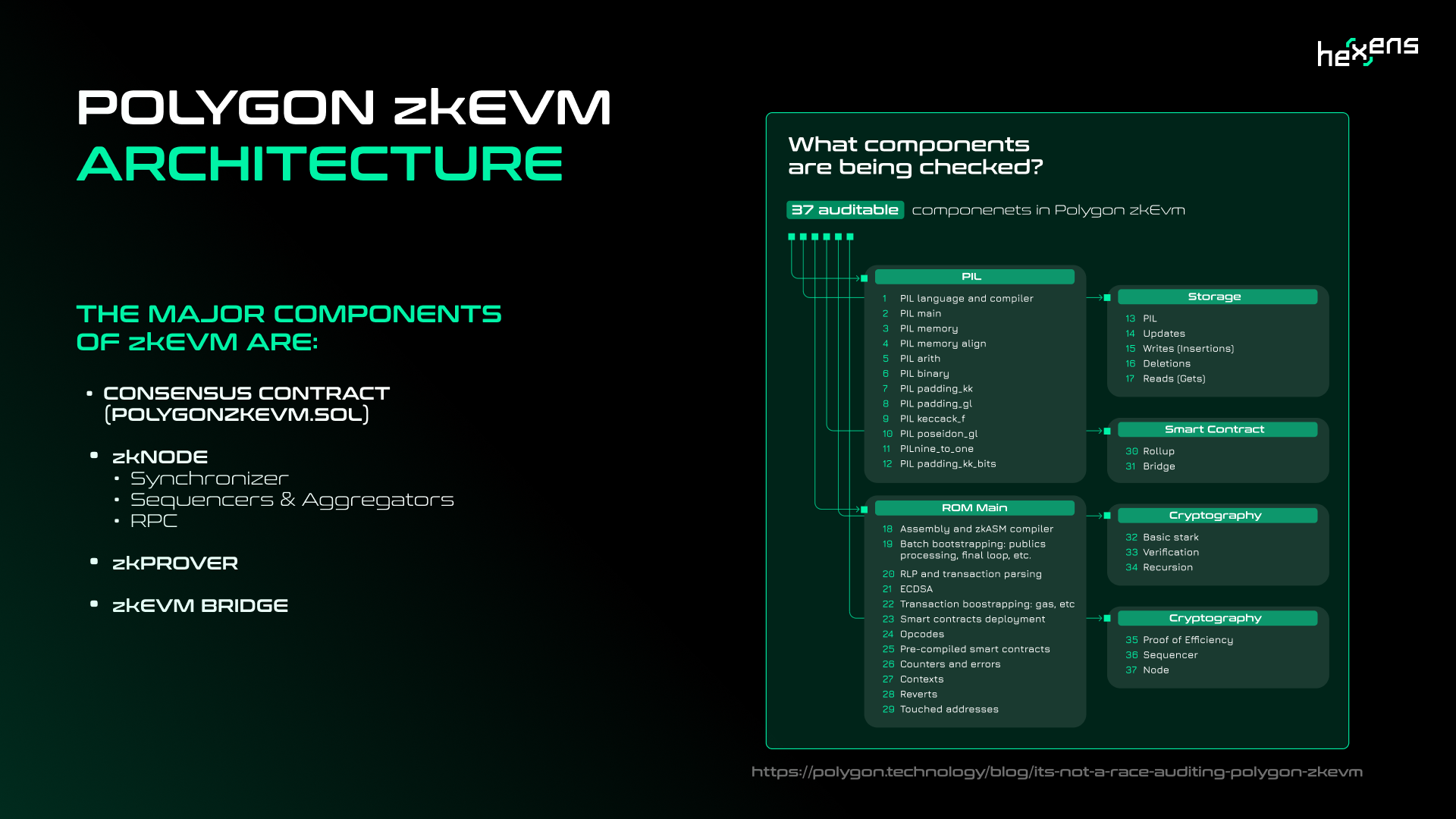 Polygon's zkEVM has the potential to revolutionize Ethereum scaling and bring increased adoption of zero knowledge technology. However, as with any new complex system, thorough security validation is required before full production launch. This was the goal of a comprehensive audit conducted by Hexens on the core components of zkEVM, including the smart contracts, prover and ROM.