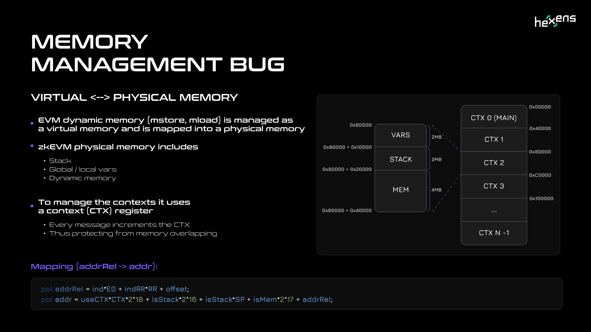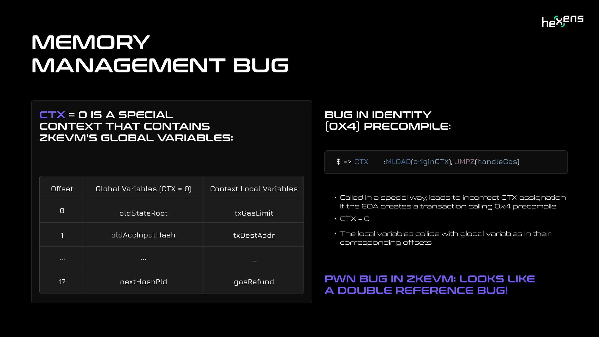 Another critical finding involved incorrect handling of CTX, the virtual address spaces used by zkEVM to manage contract call contexts. Specifically, the security engineers found issues in the identity precompile contract's context switching logic.