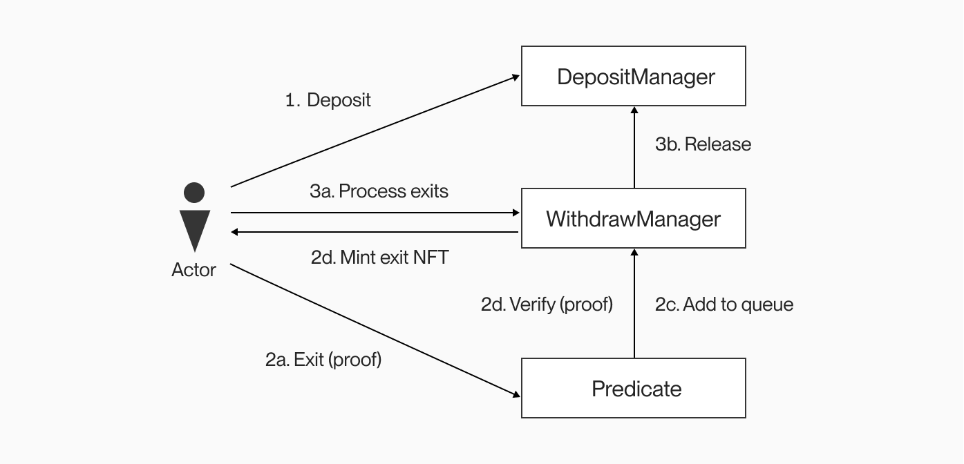 This diagram shows a simplified version of the Plasma bridge. It employs a DepositManager, where users can deposit their POL and it acts as an escrow. The WithdrawManager is responsible for verification of proofs, as well as keeping an exit queue. This exit queue would have been used more if Plasma was used, but it’s currently just a queue with a waiting time of 1 block. This means that you can nearly immediately process your exit NFT after exiting. Finally, there is the predicate contract and there is a type for each token type: ERC20, ERC721 and ERC1155. In the case of the Polygon Plasma bridge, only the ERC20PredicateBurnOnly is used with the ERC20 POL.